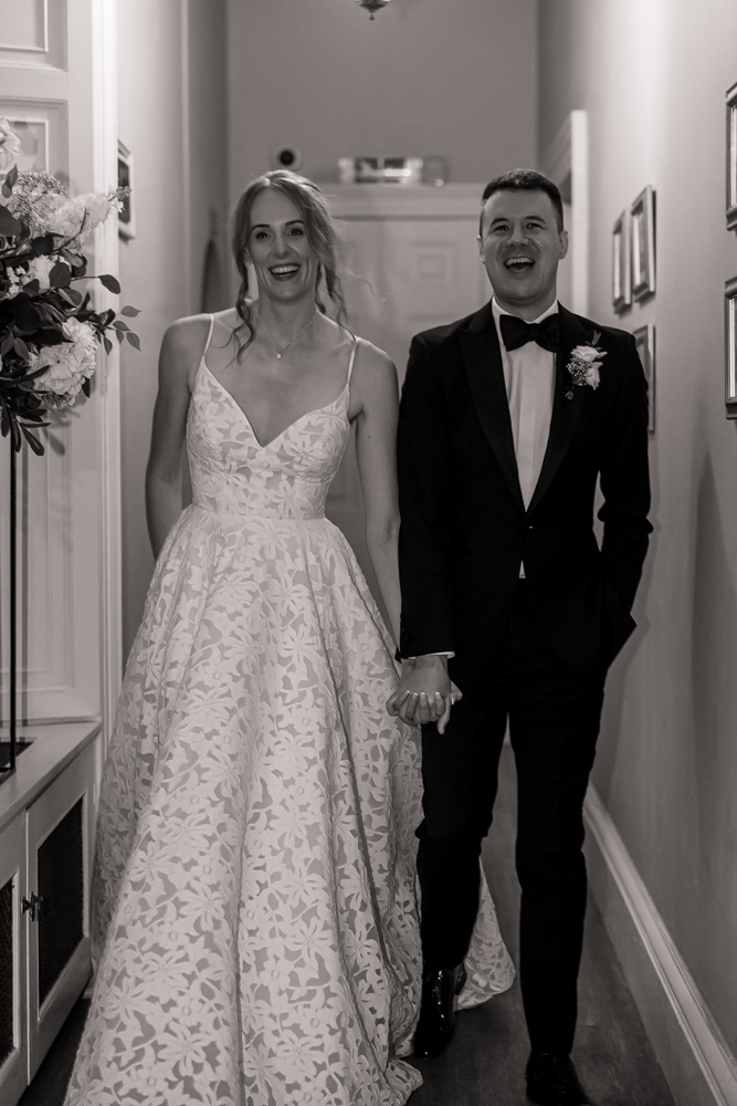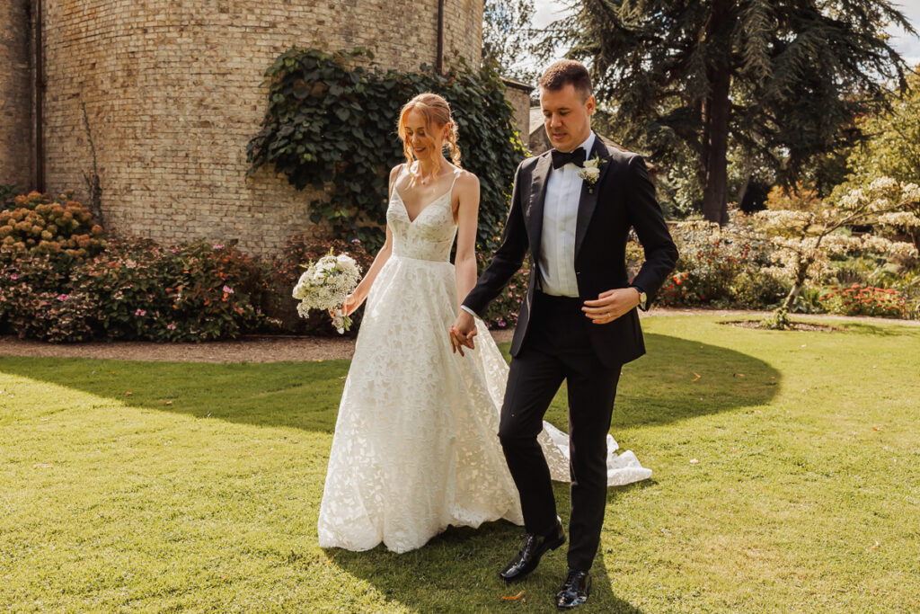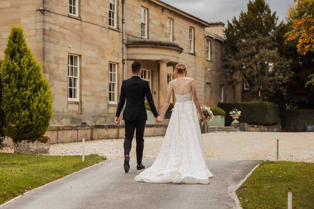 A bride in a white lace gown holds a bouquet and a groom in a black tuxedo walk together, smiling and holding hands, outside Saltmarshe Hall's grand stone building on a cloudy day.