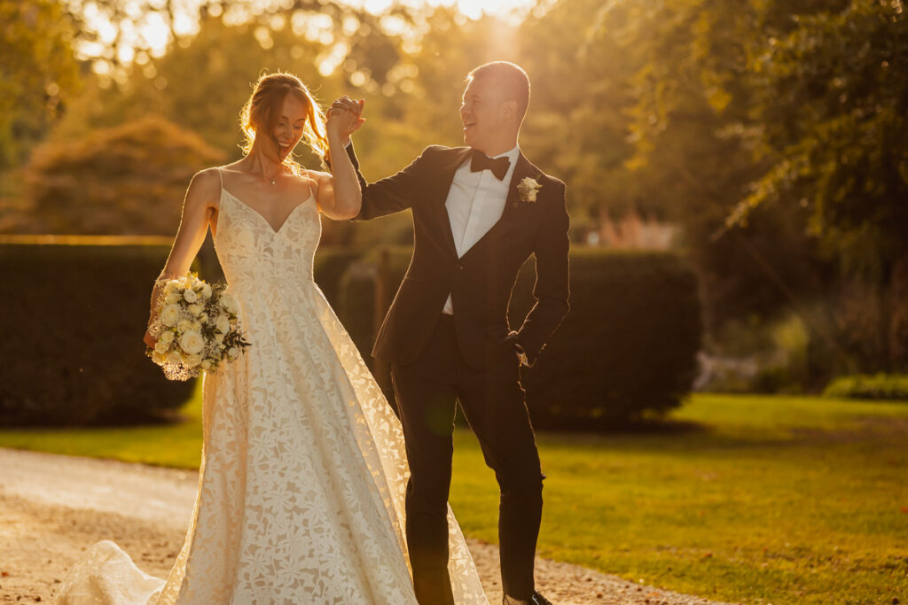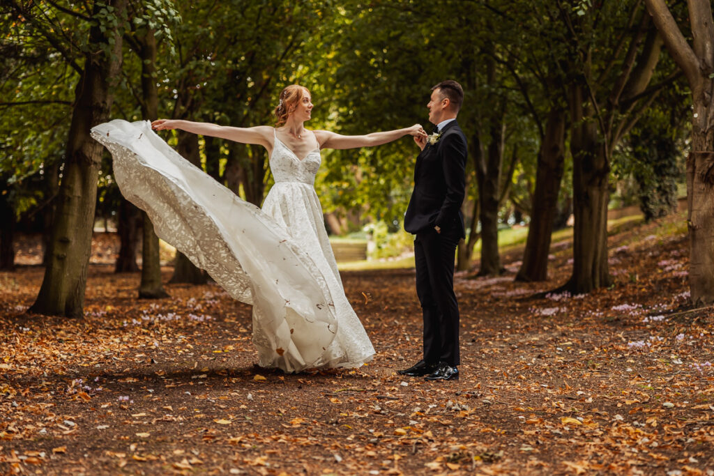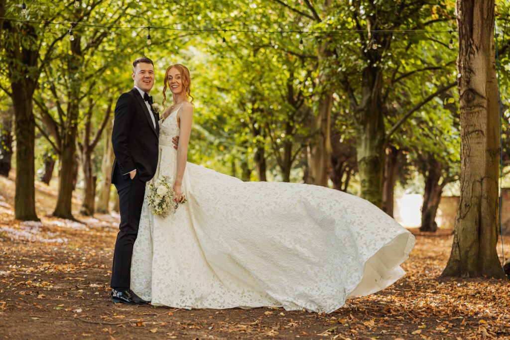 A bride in a white gown and a groom in a black suit hold hands and pose along Saltmarshe Hall’s tree-lined, leafy pathway, surrounded by warm autumn colors.