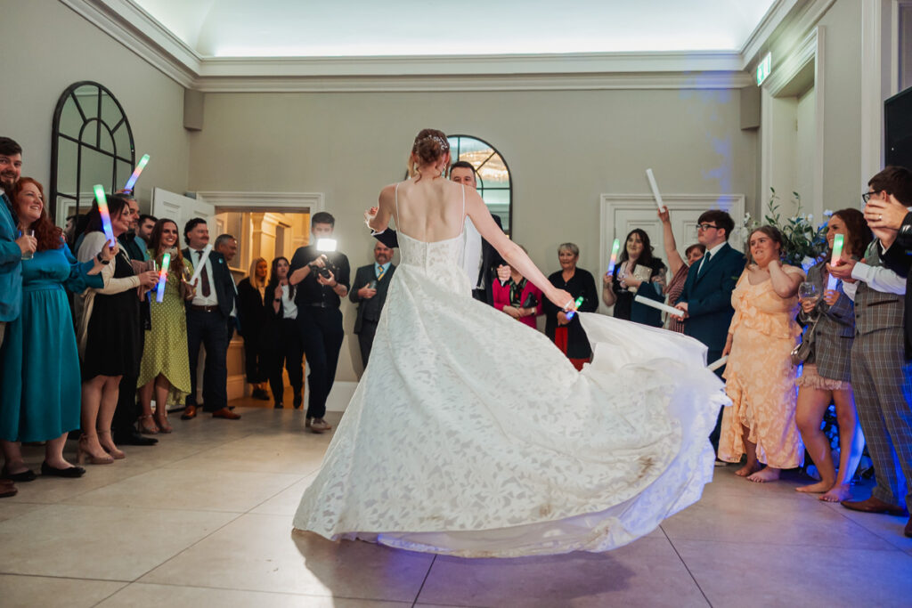 A bride and groom joyfully dance together at their Saltmarshe Hall wedding reception, surrounded by clapping and smiling guests. The bride’s dress flares as they spin, filling the scene with celebration and happiness.