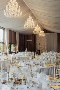 • Venue: Modern barn with beams, glass doors, and underfloor heating.