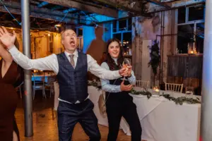 Once the ceremony room is turned around, guests are guided into the stunning bar next door – the perfect spot to relax and enjoy a drink with friends and family. It’s an ideal moment for me as a Holmes Mill wedding photographer to capture those candid interactions before we dive into the family group shots and, of course, that all‑important confetti moment.