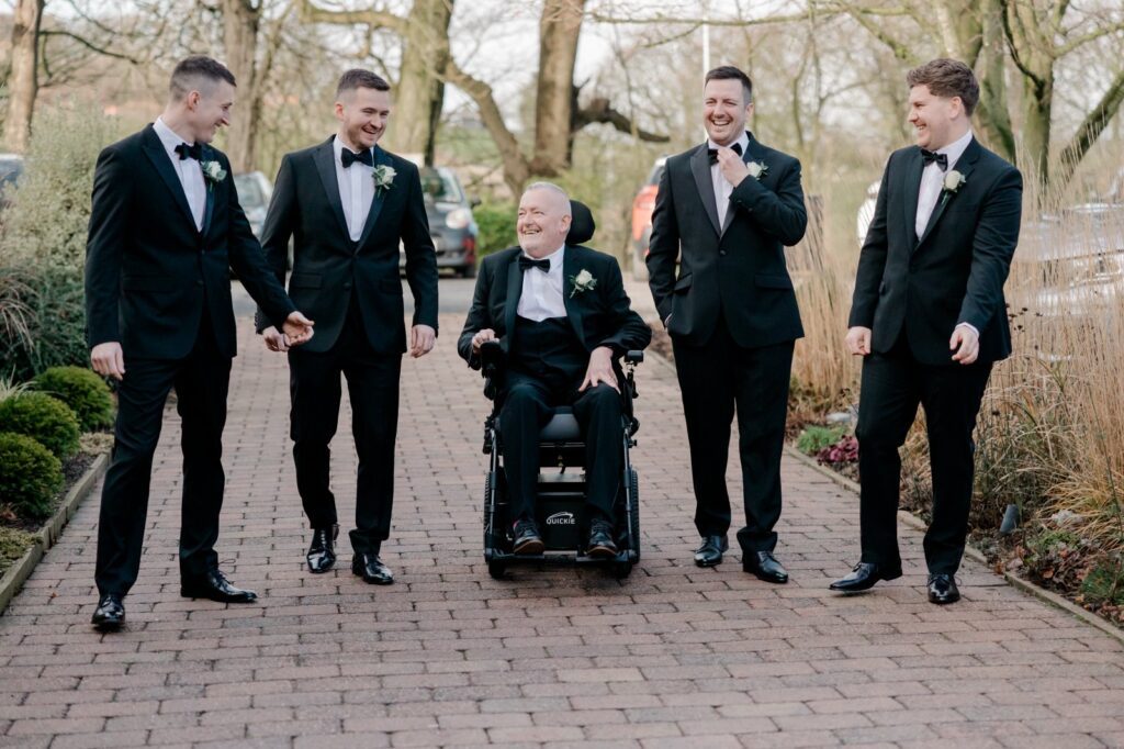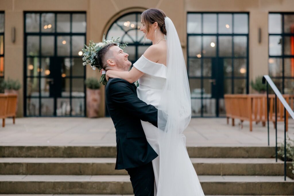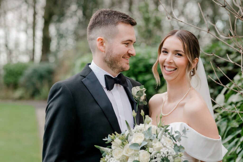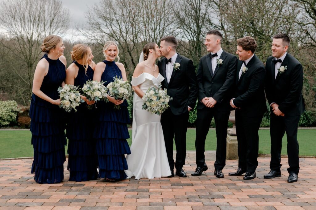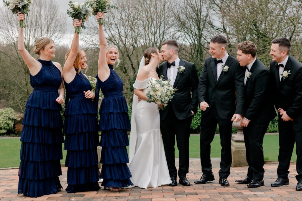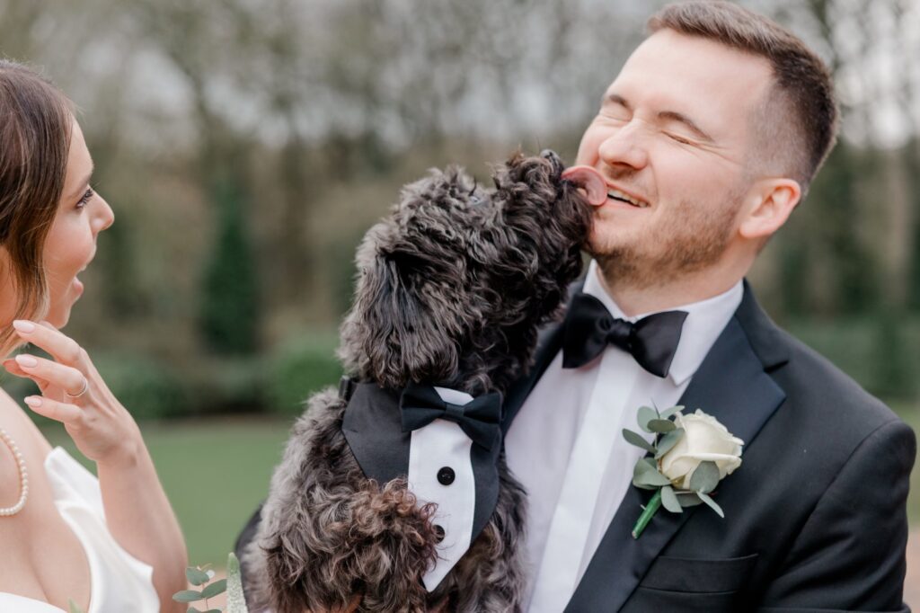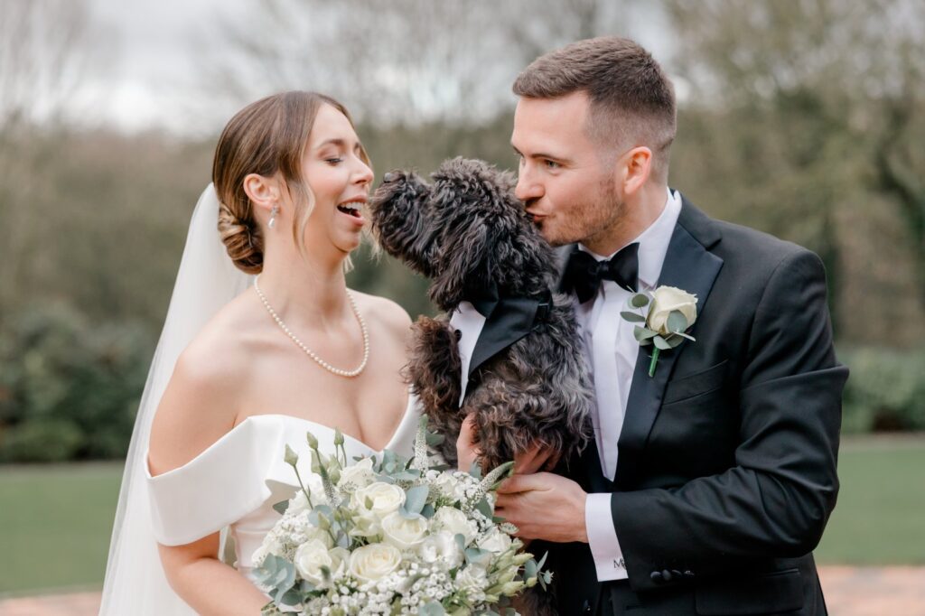 The landscaped gardens at this Yorkshire wedding venue give you everything you need for breathtaking couple portraits. Lush greenery, elegant backdrops, and open countryside views — and on this occasion, Sully the dog made a special appearance to say hello to his humans. The pawfect addition to the album.