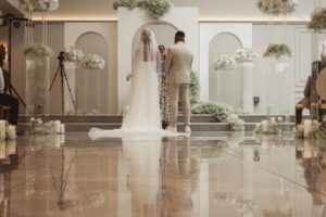 The spacious marble ballroom can host up to 400 guests for larger weddings, while still being flexible enough to create a warm, intimate atmosphere for smaller celebrations.